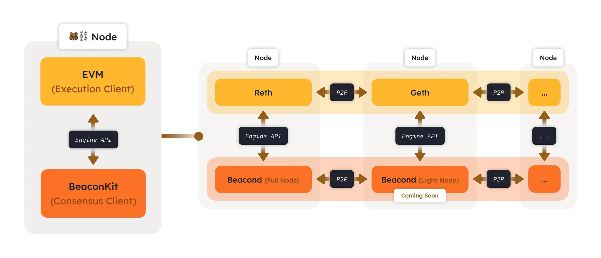 After bArtio, BeraChain changed the architecture of the node by creating beaconkit (https://github.com/berachain/beacon-kit) with EVM as the execution layer and Cosmos tendermint as the consensus layer.